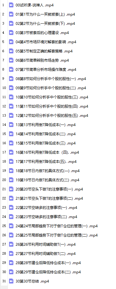 说禅人—解套宝典/ ├──00试听课-说禅人 .mp4 32.26M ├──01第1节为什么一买就被套(上) .mp4 70.14M ├──02第2节为什么一买就被套(下) .mp4 74.23M ├──03第3节被套后的心理建设 .mp4 56.98M ├──04第4节市场环境对解套的影响 .mp4 67.09M ├──05第5节制定正确的解套策略 .mp4 67.64M ├──06第6节简单辨别市场走势 .mp4 71.98M ├──07第7节简单分析市场操作难度 .mp4 76.45M ├──08第8节如何分析手中个股的股性(一) .mp4 66.82M ├──09第9节如何分析手中个股的股性(二) .mp4 70.40M ├──10第10节如何分析手中个股的股性(三) .mp4 72.67M ├──11第11节如何分析手中个股的股性(四) .mp4 69.85M ├──12第12节如何分析手中个股的股性(五) .mp4 65.89M ├──13第13节利用倒T降低成本(一) .mp4 85.70M ├──14第14节利用倒T降低成本(二) .mp4 66.26M ├──15第15节利用倒T降低成本(三) .mp4 84.82M ├──16第16节利用倒T降低成本(四). .mp4 65.32M ├──17第17节利用倒T降低成本(五). .mp4 37.71M ├──18第18节日内做T的具体方式(—) .mp4 66.02M ├──19第19节日内做T的具体方式(二) .mp4 68.83M ├──20第20节空头下做T的注意事项(一) .mp4 52.98M ├──21第21节空头下做T的注意事项(二) .mp4 62.94M ├──22第22节空转多的注意事项(一) .mp4 59.98M ├──23第23节空转多的注意事项(二) .mp4 55.70M ├──24第24节局部趋势下对于做T仓位的管理(一) .mp4 57.61M ├──25第25节局部趋势下对于做T仓位的管理(二) .mp4 73.61M ├──26第26节利用时间辅助做T(一) .mp4 61.98M ├──27第27节利用时间辅助做T(二) .mp4 67.05M ├──28第28节建仓后降低持仓成本(一) .mp4 50.31M ├──29第29节建仓后降低持仓成本(二) .mp4 53.00M └──30第30节总结 .mp4 32.43M
